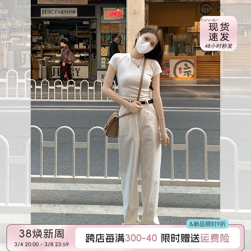宋小恩窄版阔腿裤女秋季小个子显瘦白色休闲裤加长直筒裤拖地裤子